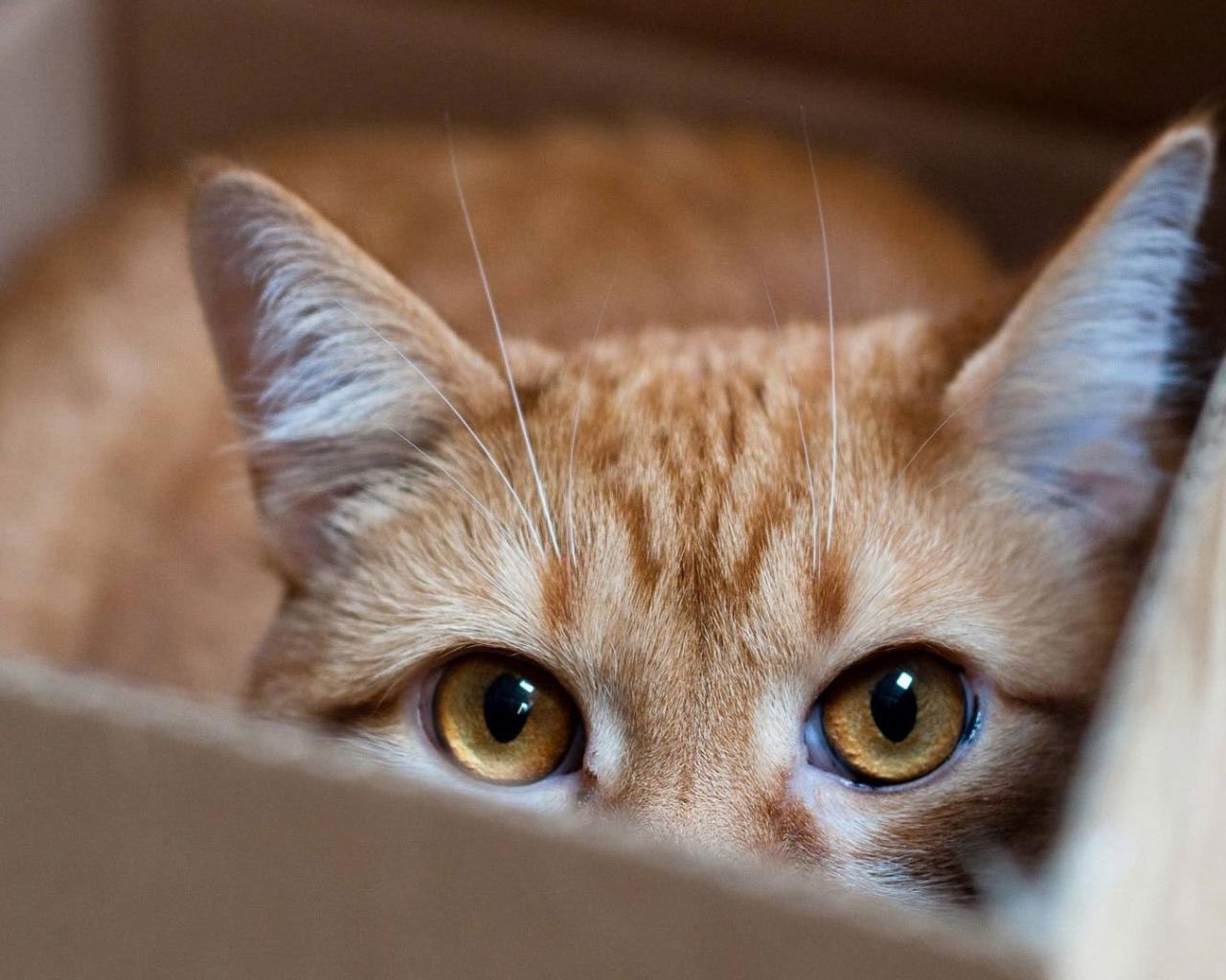 Обои Рыжий кот прячется в коробке