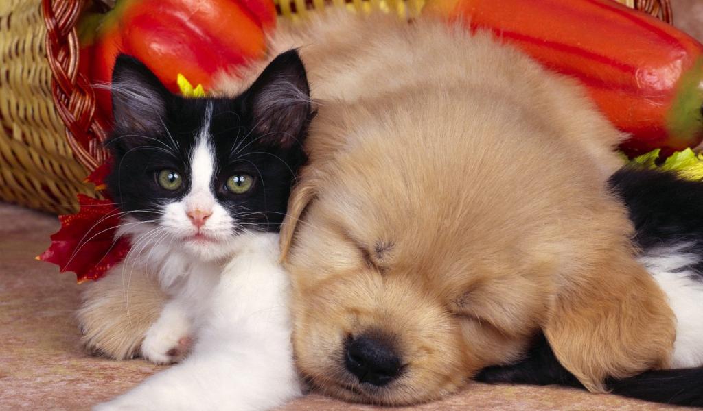» Обои Кот, пёс и овощи