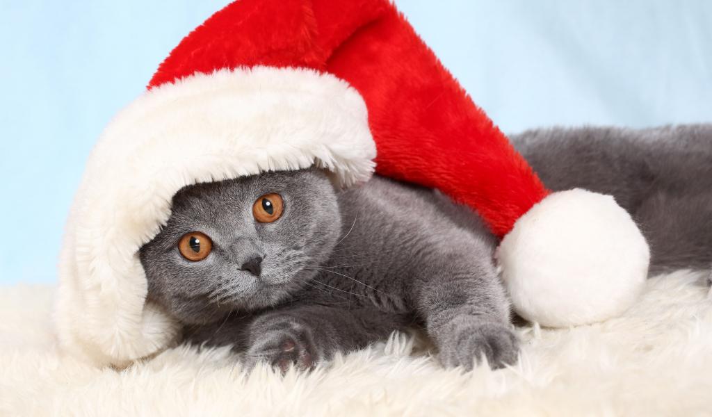 Обои Британский кот в новогодней шапке