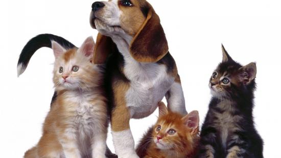 Обои Собака и три котенка