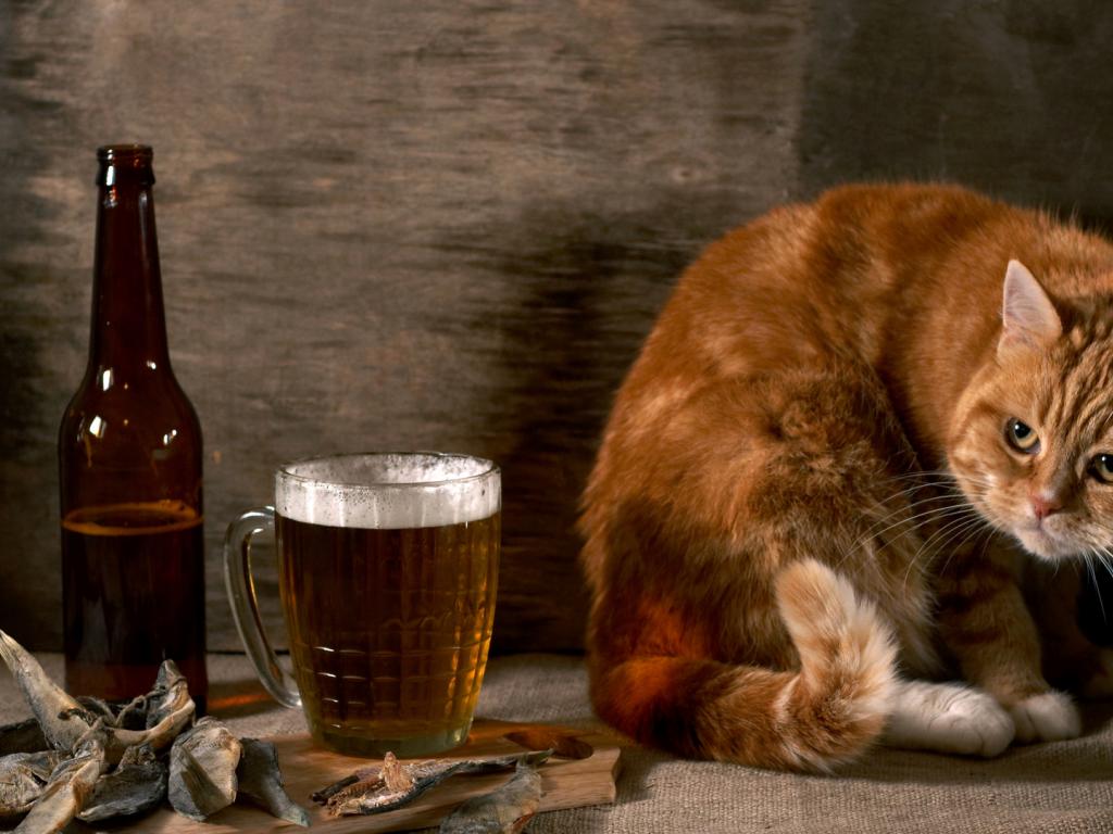 Обои Рыжий кот с пивом и рыбой