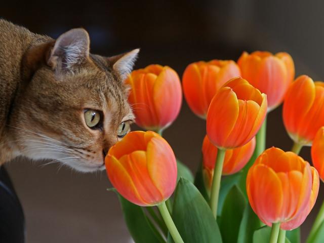 Обои Киса и тюльпаны