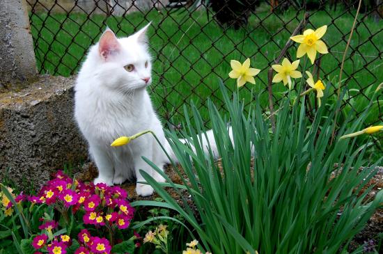 Обои Кошка турецкая ангора среди цветов