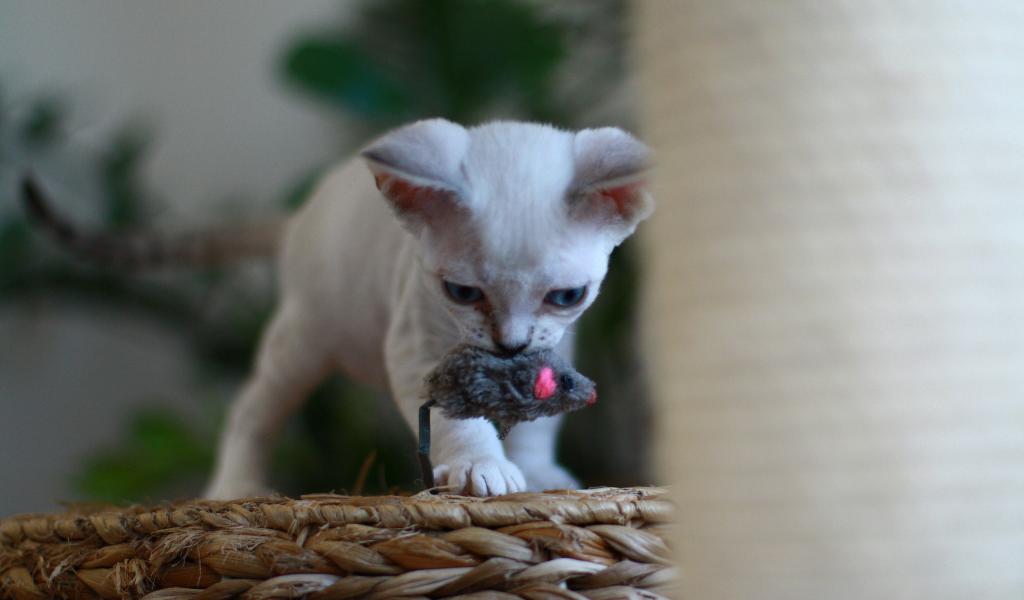 Обои Котенок девон-рекс с игрушкой