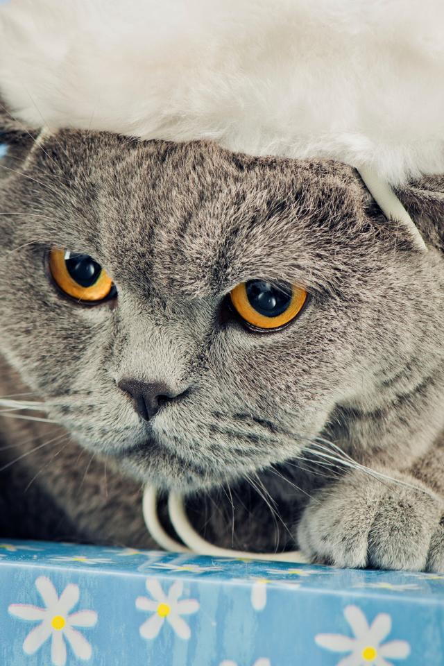 Обои Маленький шотландский вислоухий кот спит в новогодней шапке