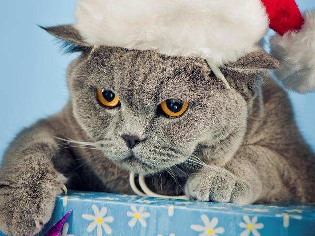 Обои Британский кот в новогодней шапке