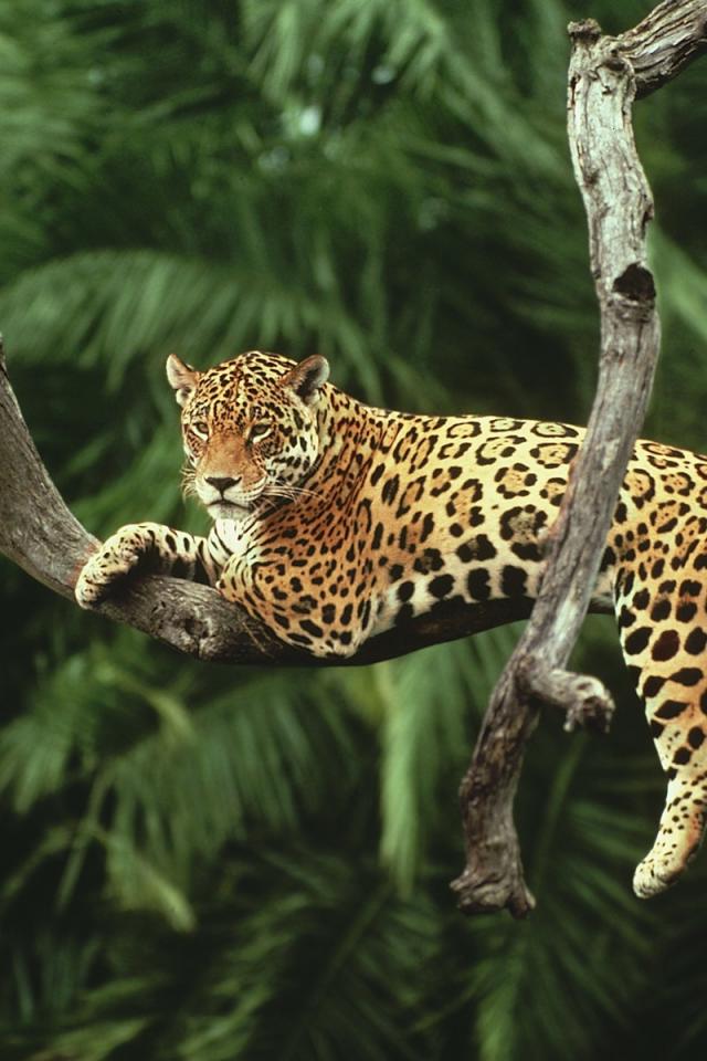 Обои Ягуар лежит на засохшем дереве