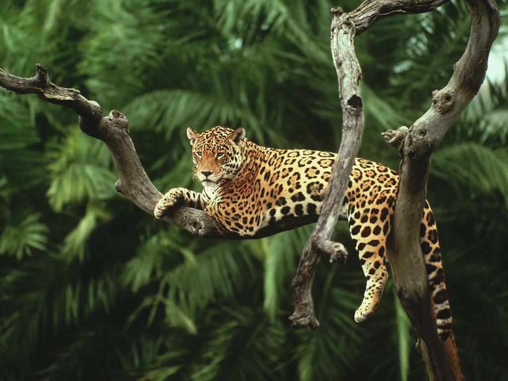 Обои Ягуар лежит на засохшем дереве