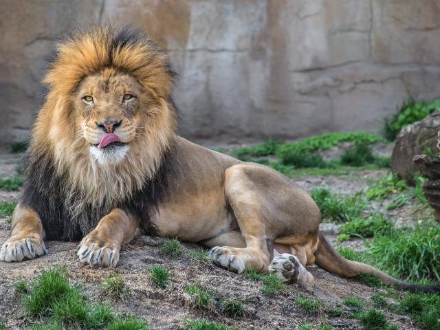 Обои Лев в зоопарке облизывает нос