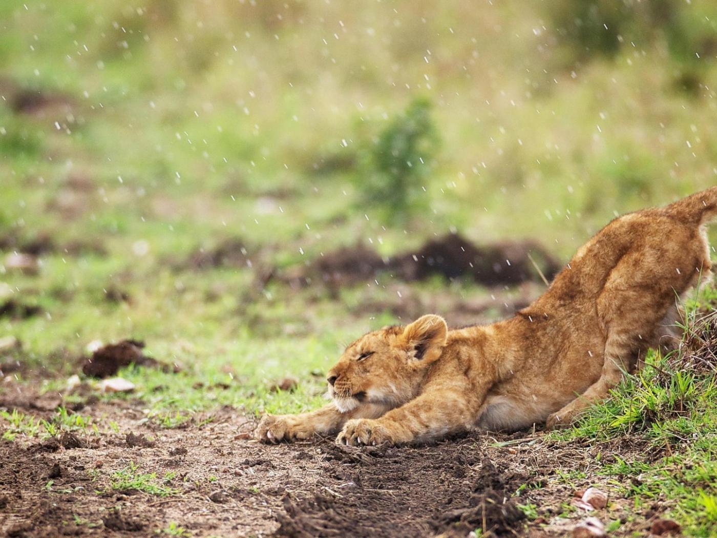 Обои Львенок стоит под дождем