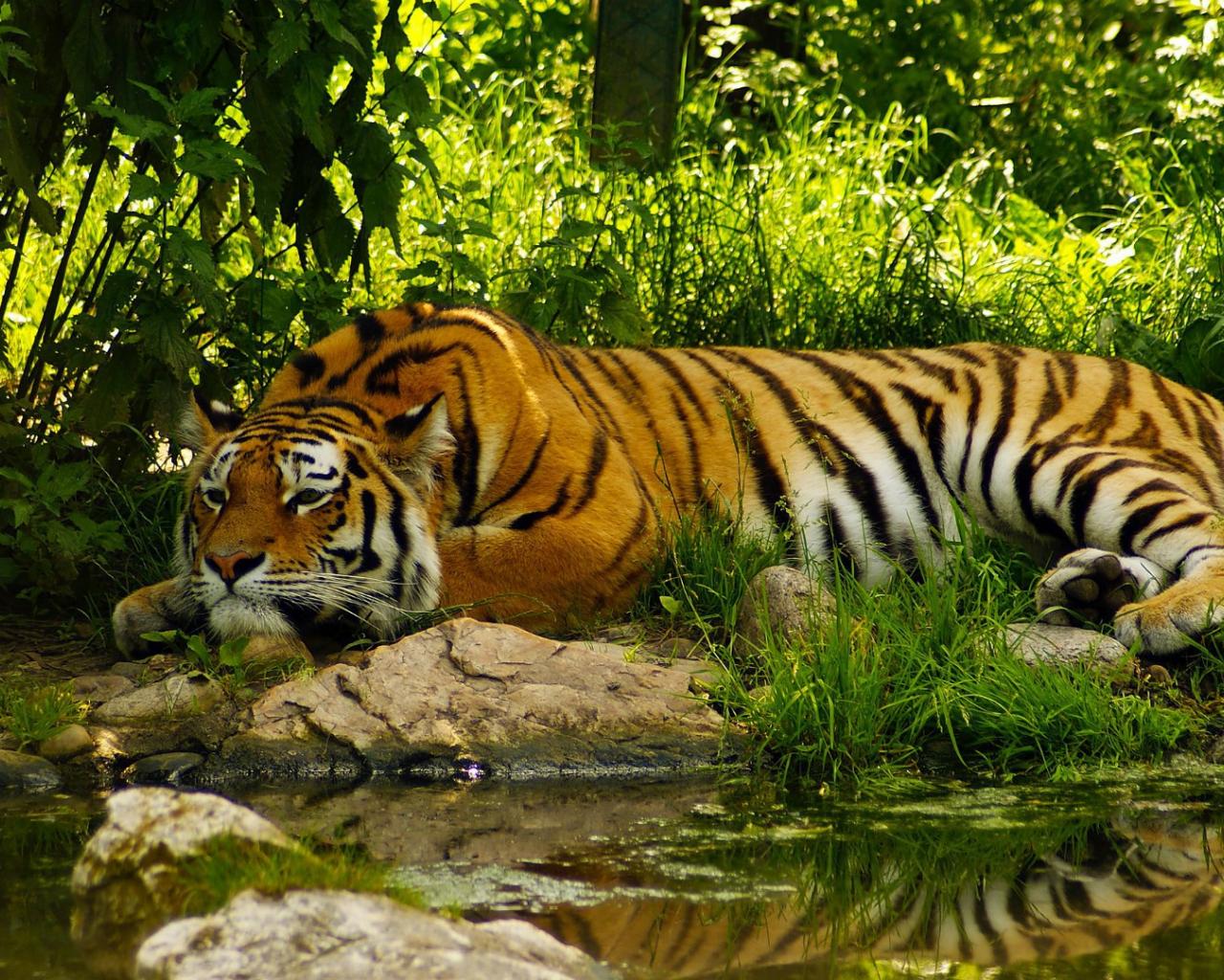 Обои Умиротворенный тигр у воды