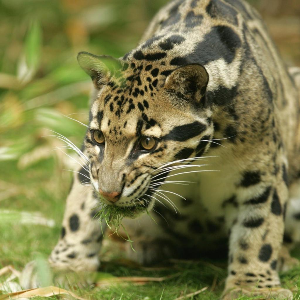 Обои Леопард с травой в зубах
