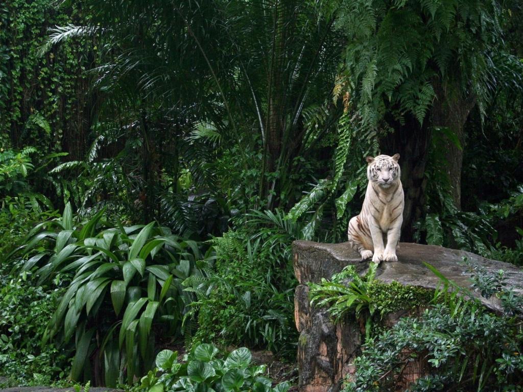 Обои Тигр сидит на камне среди джунглей