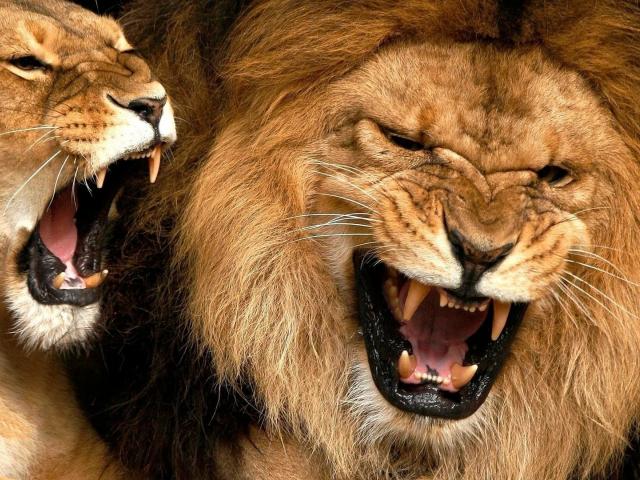 Обои Лев и львица показывают клыки