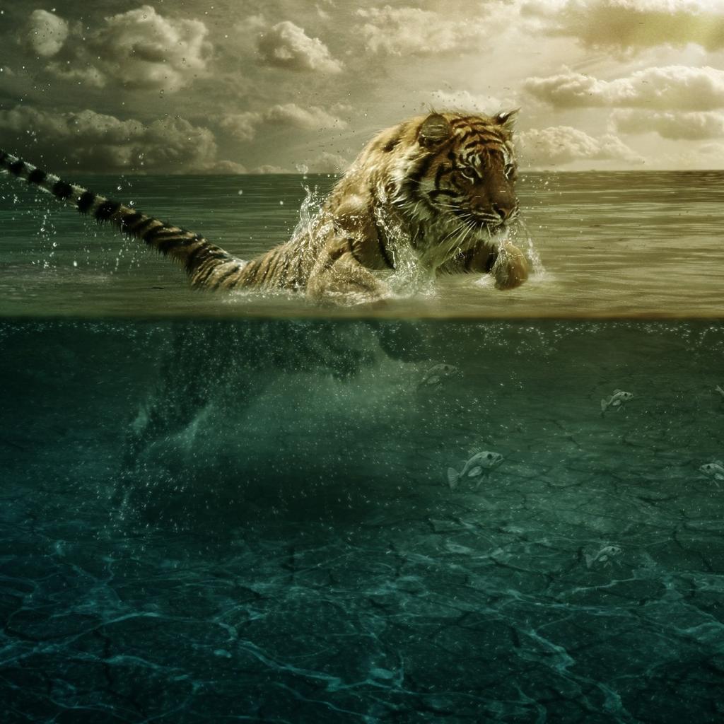 Обои Тигр ловит рыбу