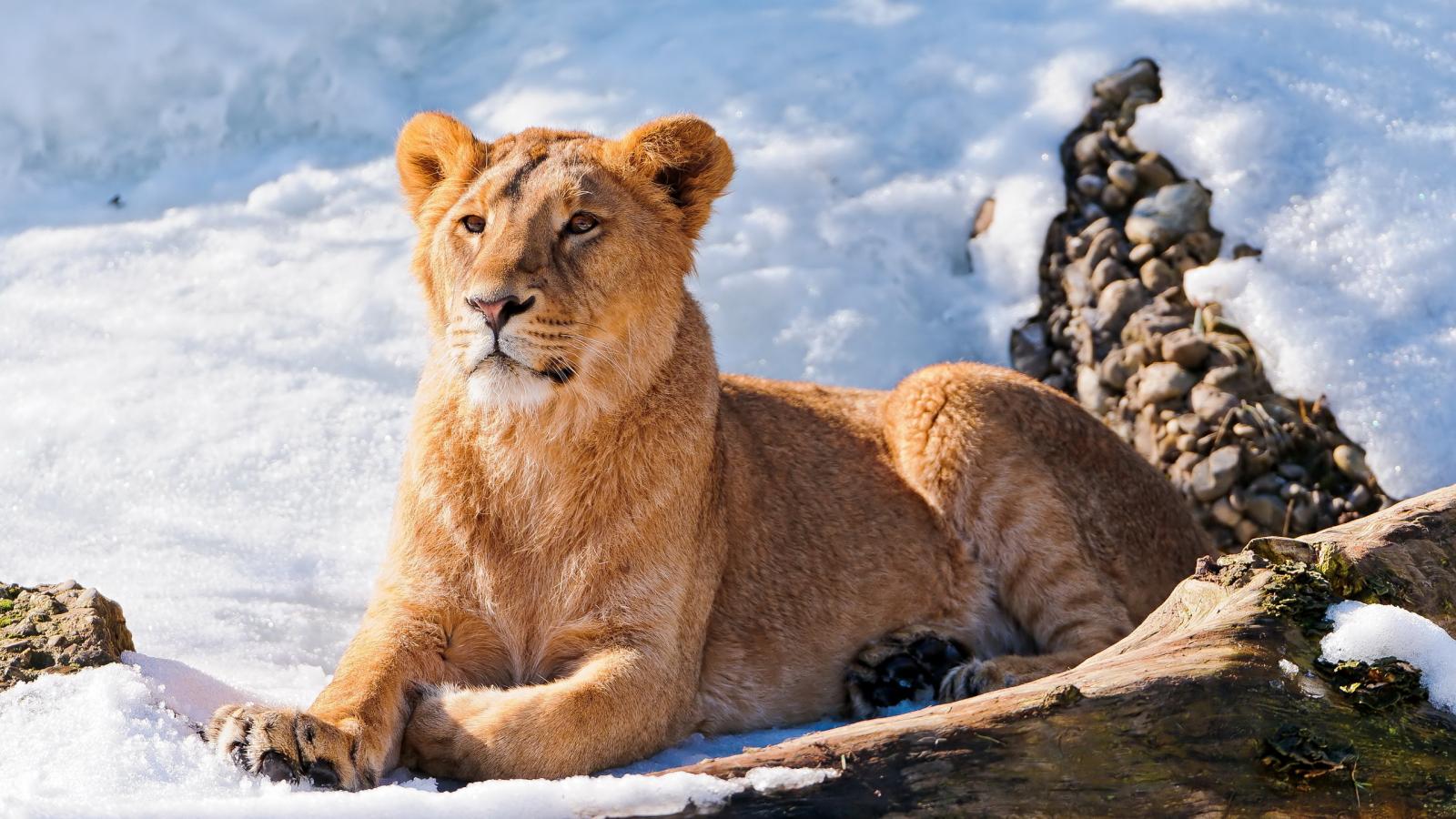 Обои Львица на снегу