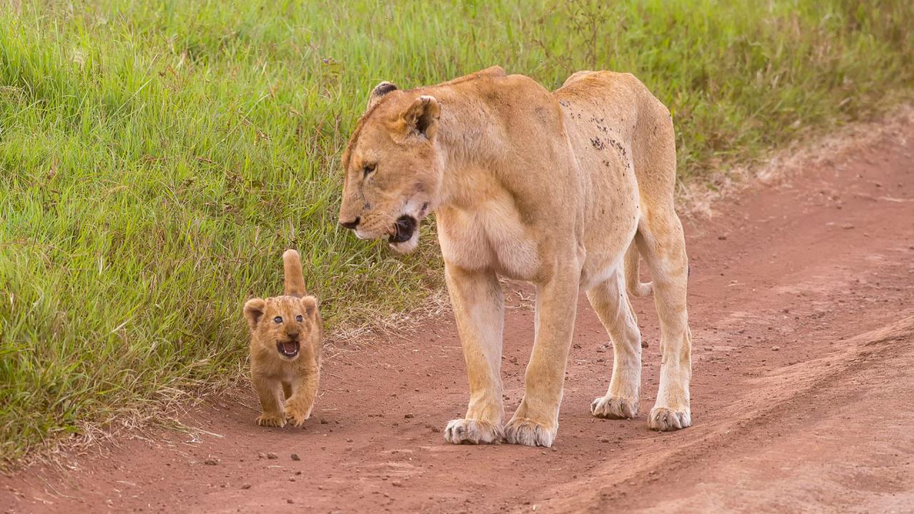 Обои Львенок с мамой идут по дороге