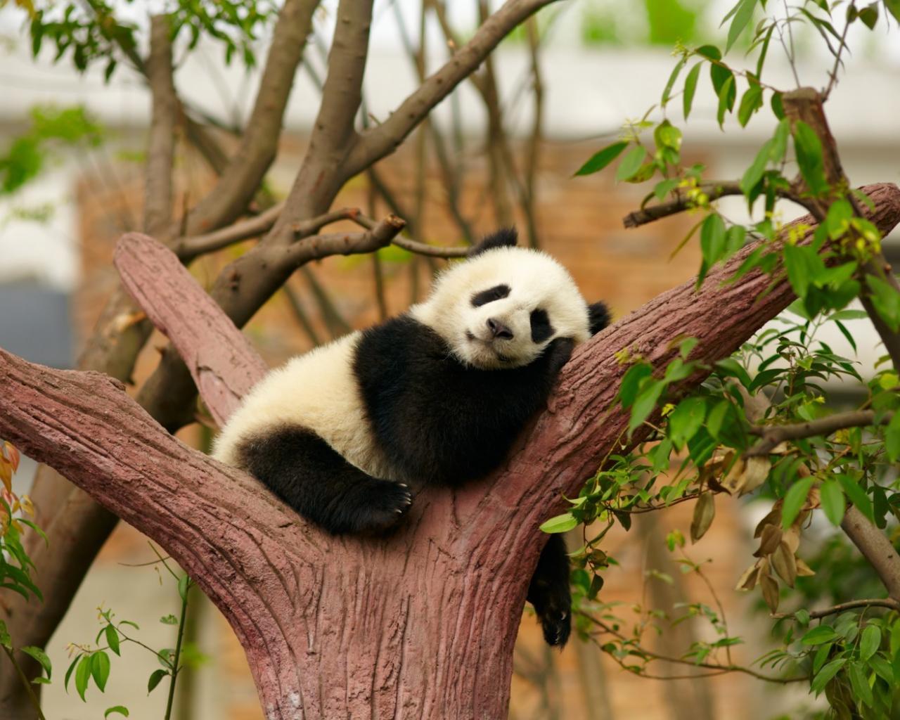 Обои Маленькая панда сладко спит в развилке дерева