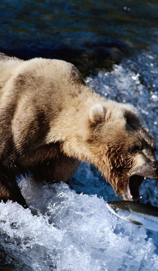 Обои Медведь поймал пастью рыбу