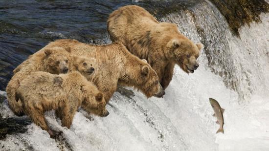Обои Семья медведей ловит рыбу во время нереста