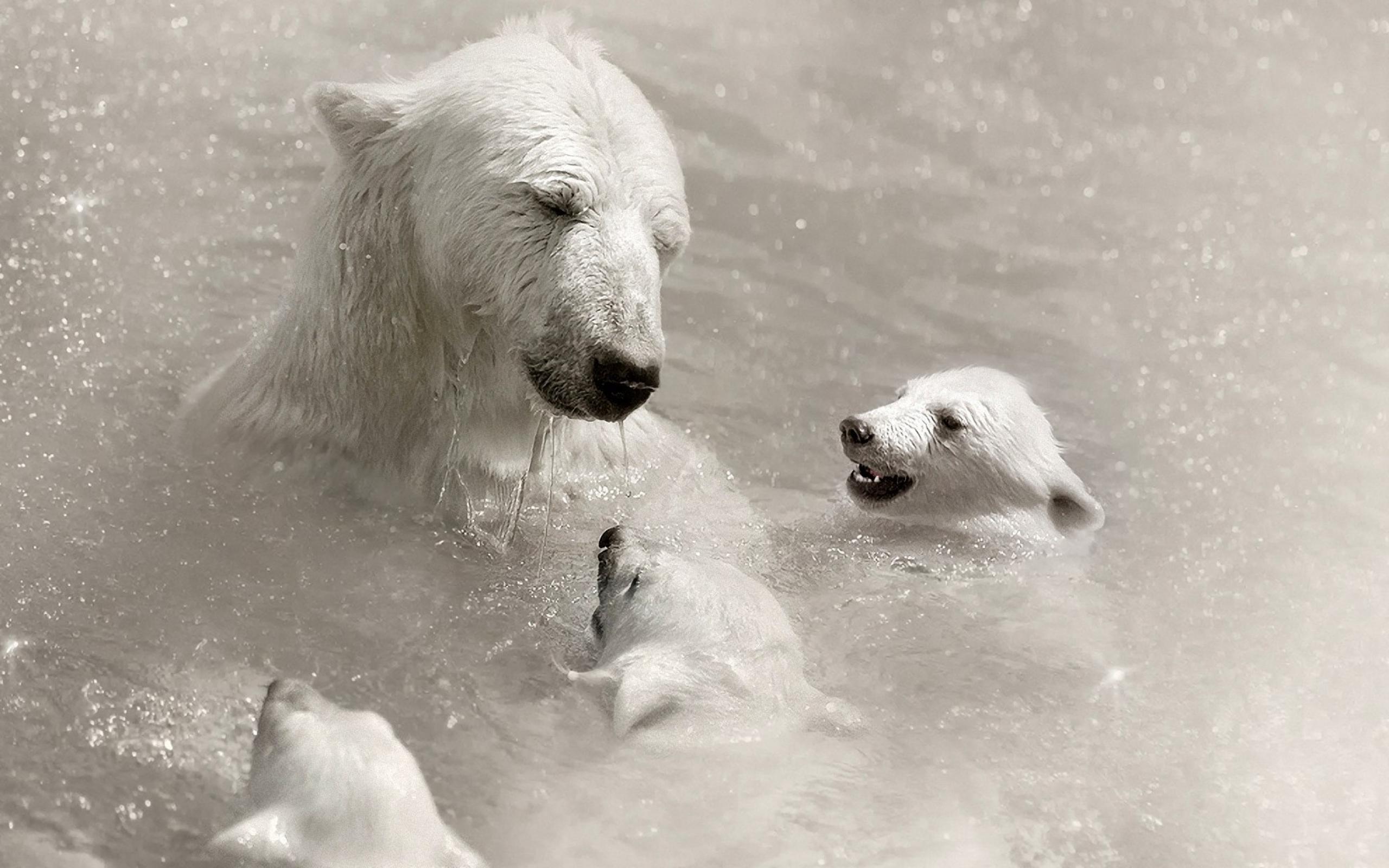 Обои Белая медведица с детьми в воде