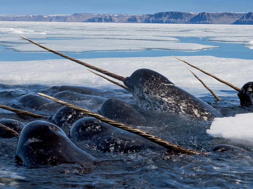 Обои Нарвалы среди льдов