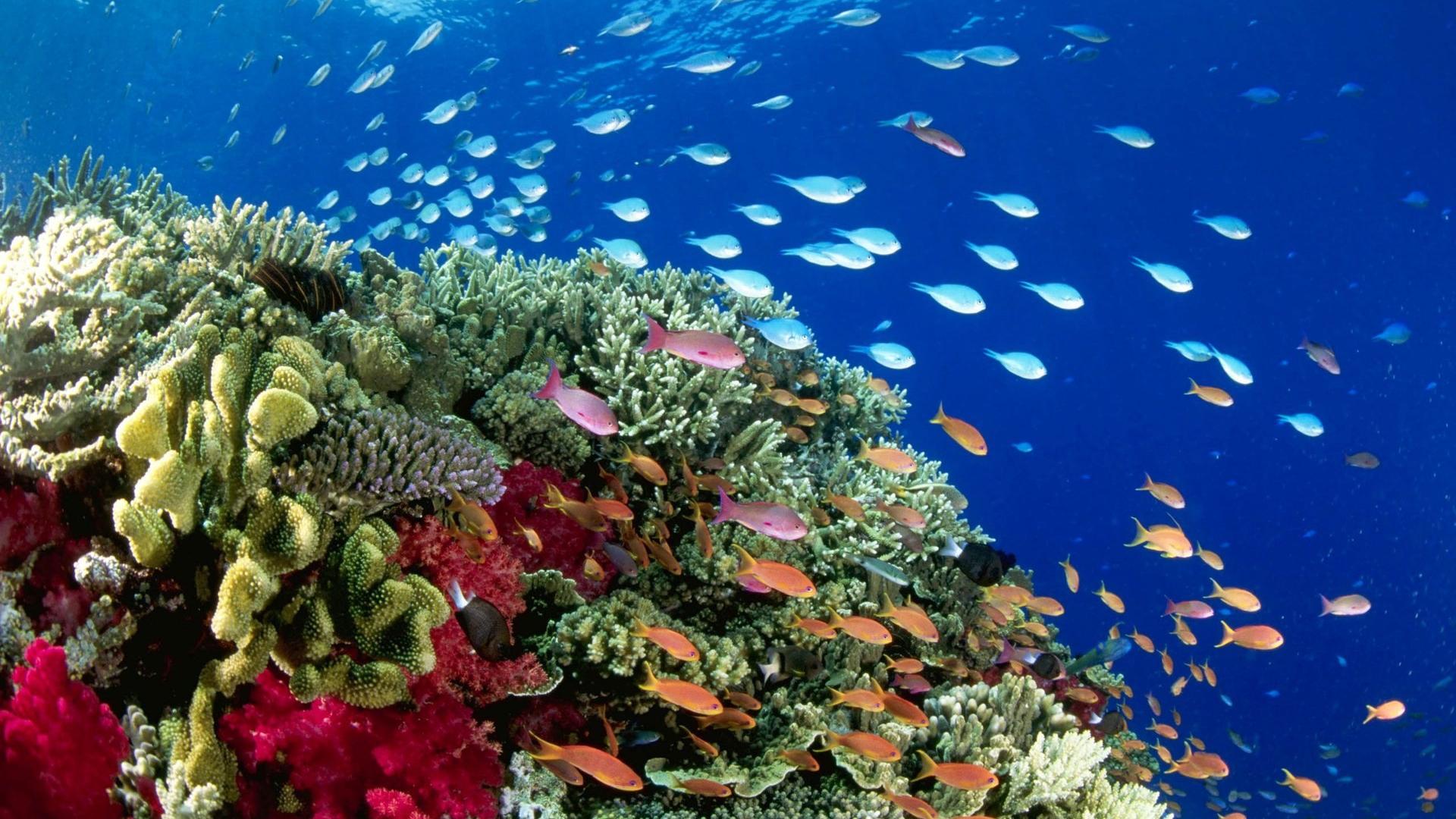 Обои Стаи рыб на коралловом рифе