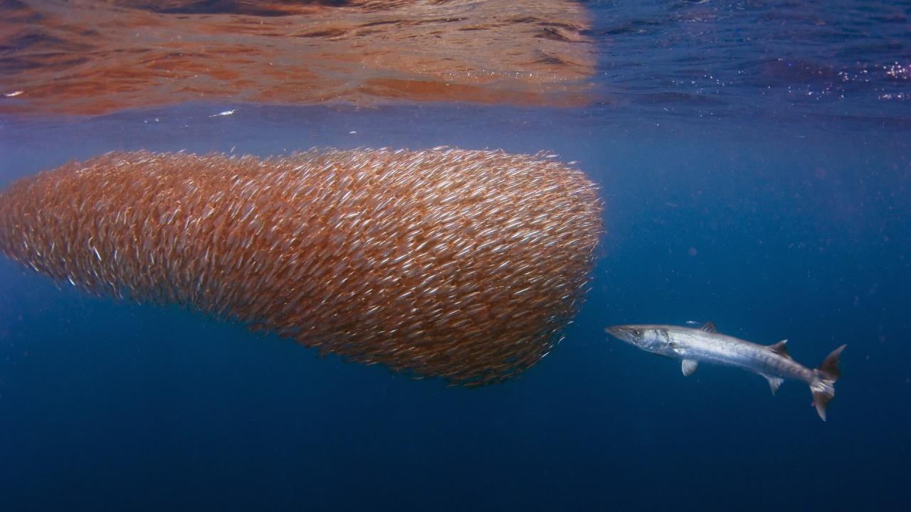 Обои Большая рыба у косяка мелких рыб