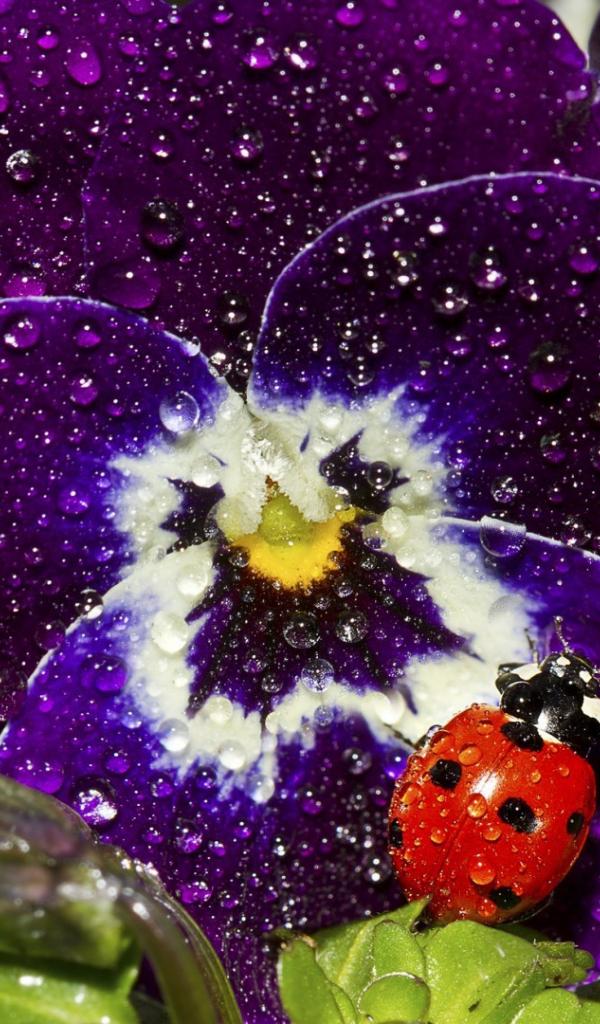Обои Красный жук на покрытом росой цветке