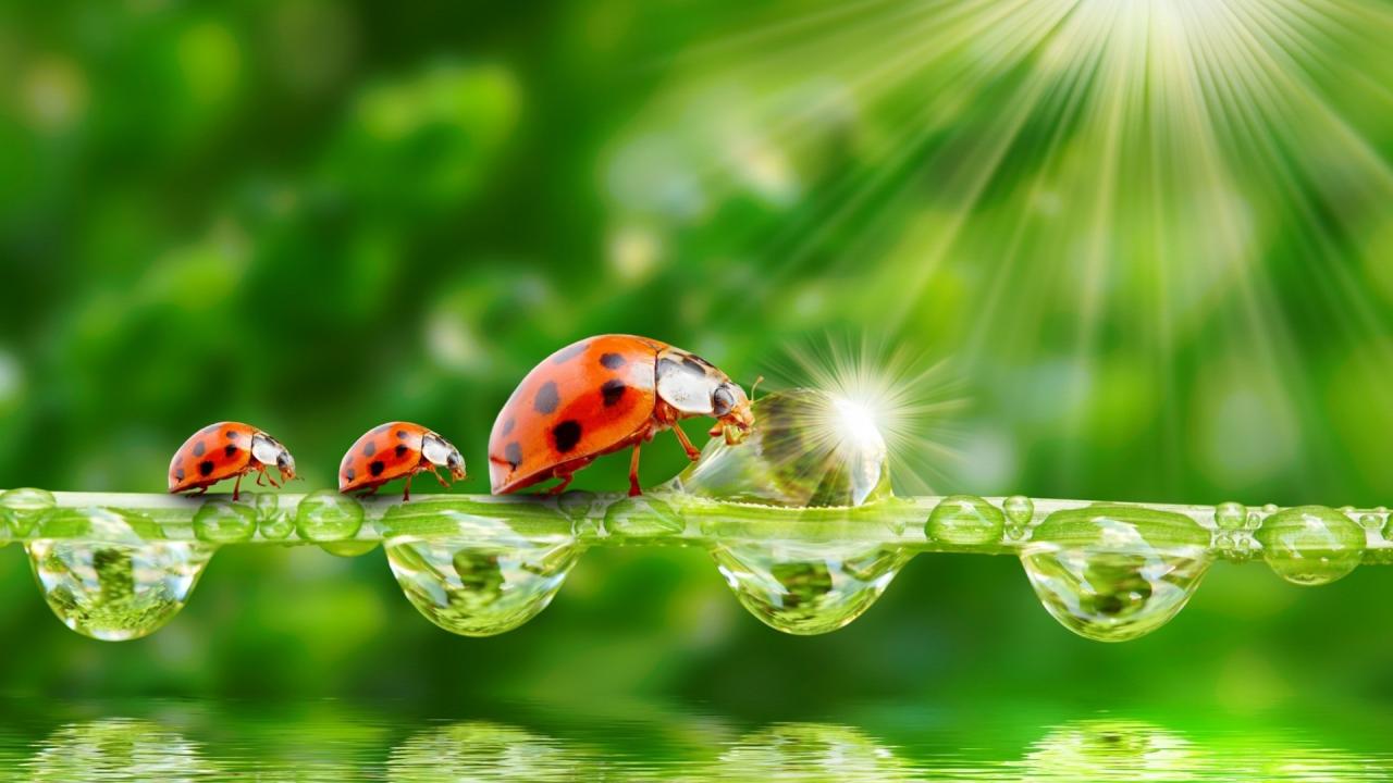 Обои Семья божьих коровок наткнулась на препятствие