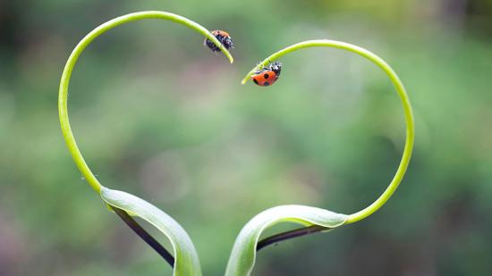 Обои Жуки божьи коровки на ростках в форме сердца