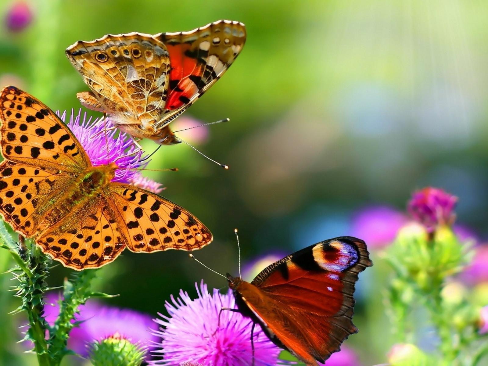 Обои Бабочки на цветах в летний день