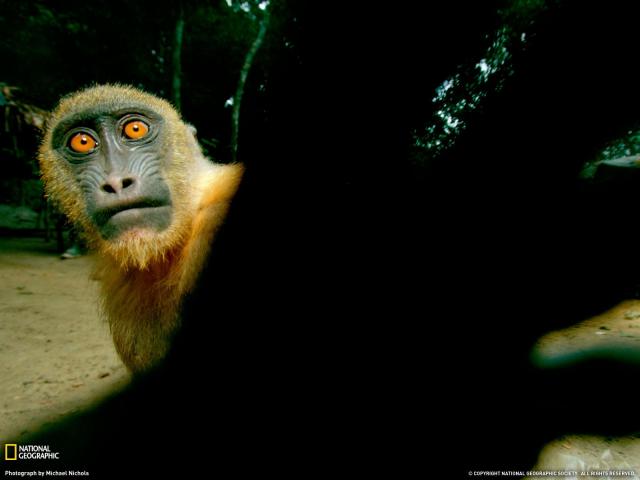 Обои Чёрный кот с жёлтыми глазами на чёрном фоне
