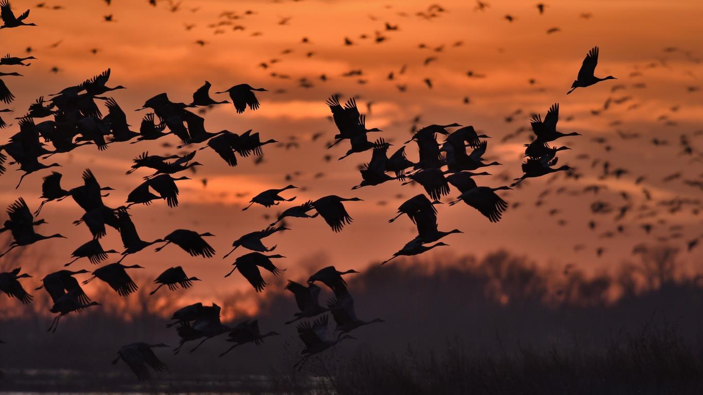 » Обои Стая диких уток на фоне заката