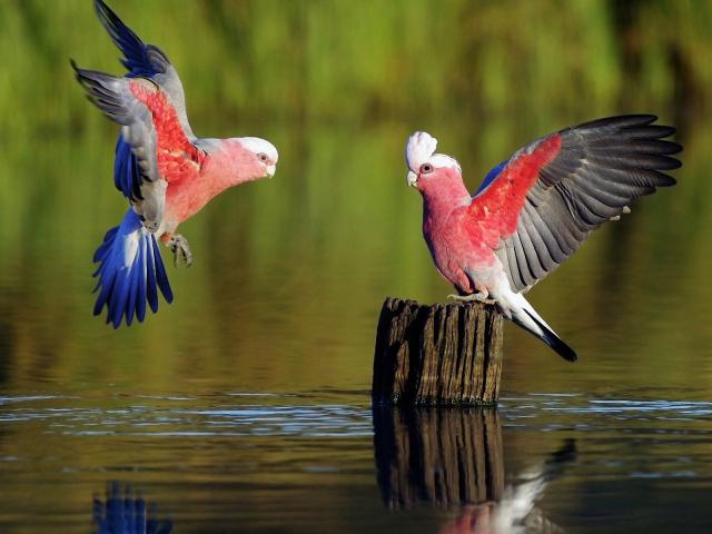 Обои Розовые птицы у пенька торчащего из воды