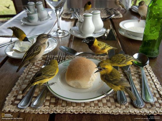 » Обои Птицы клюют хлеб на столе