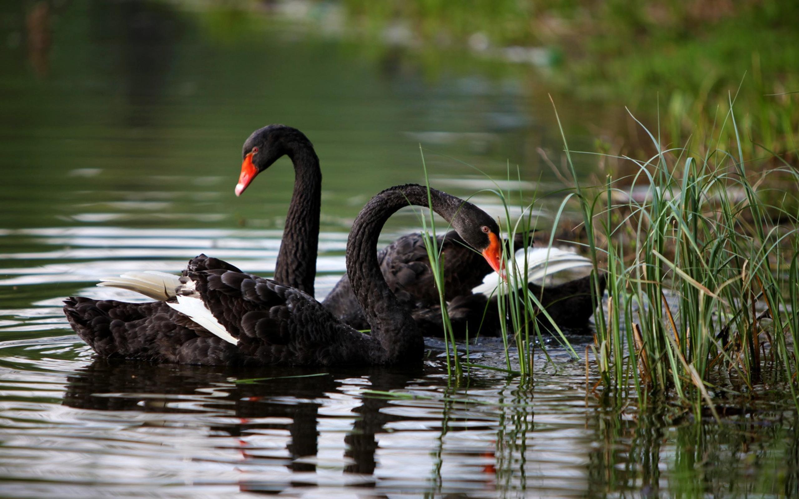 Обои Пара черных лебедей в камышах у берега