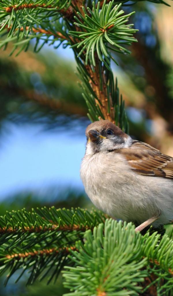 Обои Воробей на еловой ветке