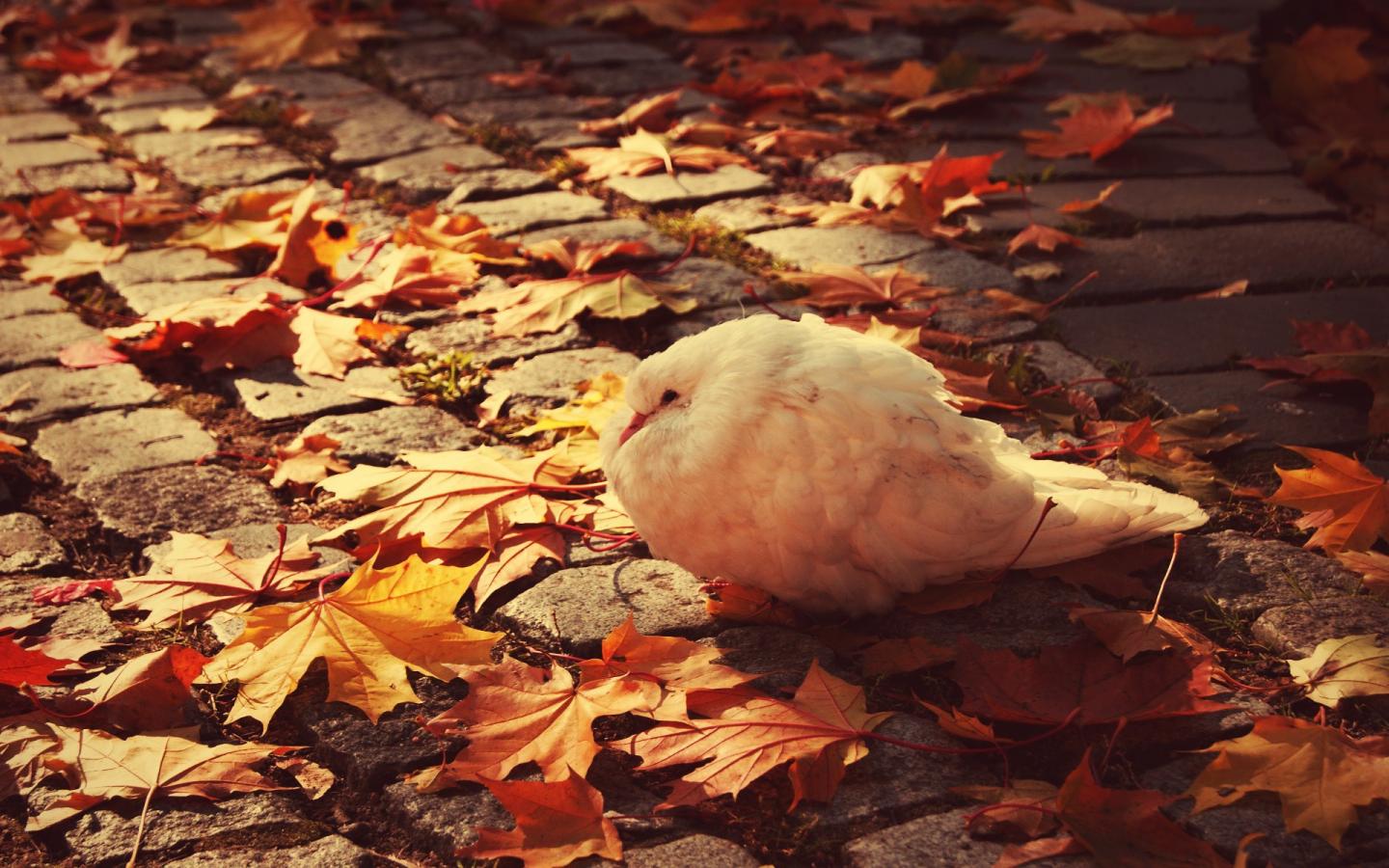 Обои Нахохлившийся белый голубь на листьях