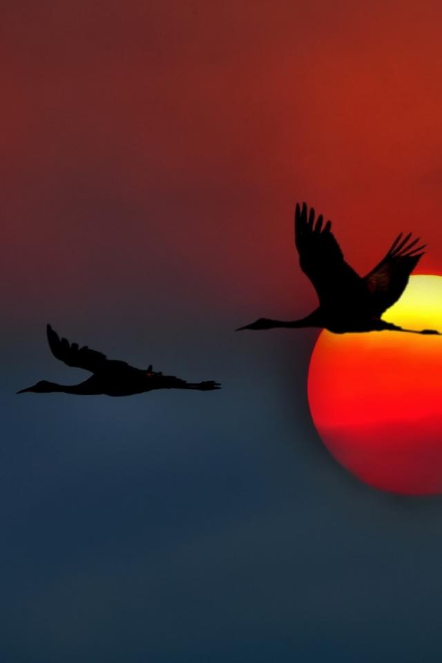 Обои Три лебедя на фоне красного солнца