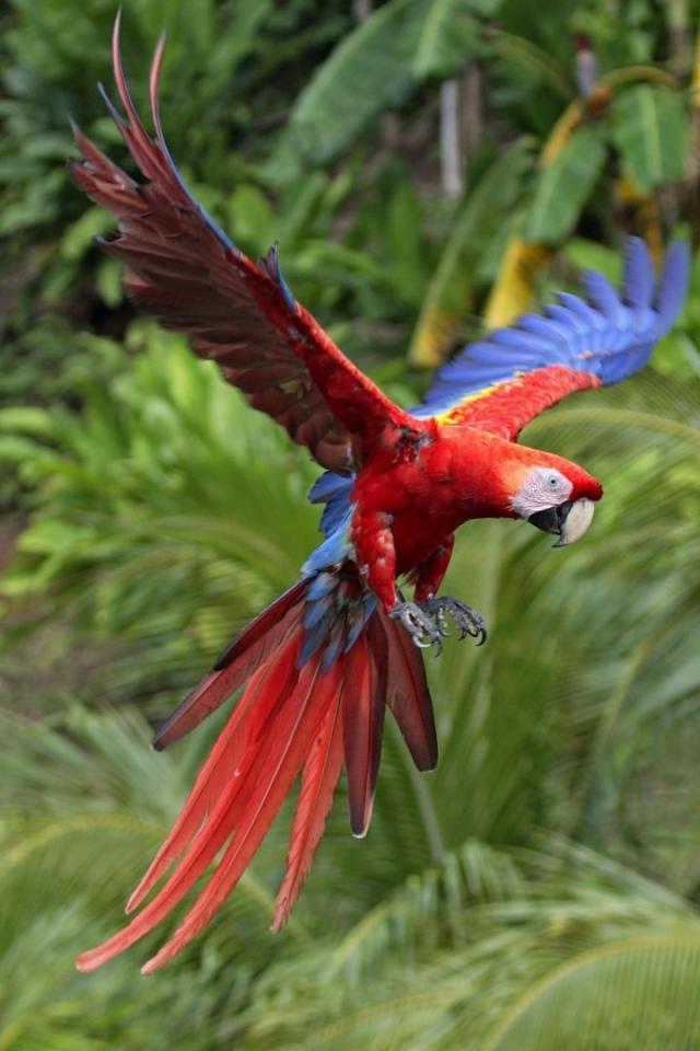 Обои Красный попугай летит в тропиках