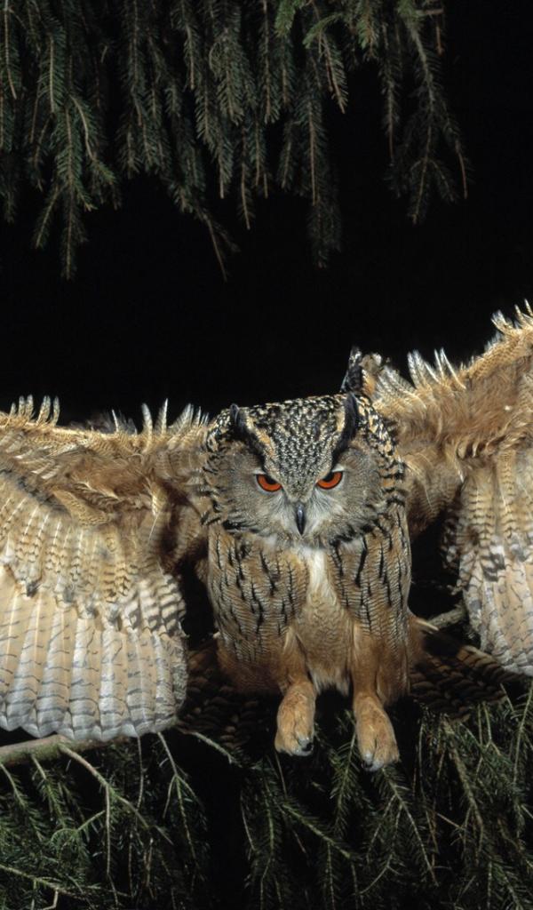 Обои Сова распустила крылья на фоне хвойного дерева