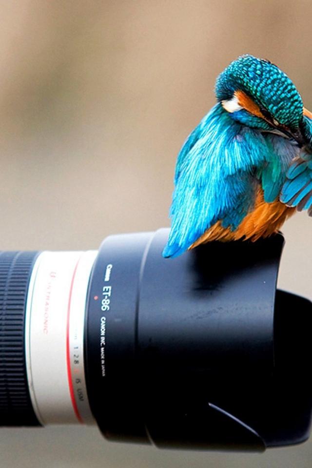 Обои Птица зимородок сидит на фотоаппарате
