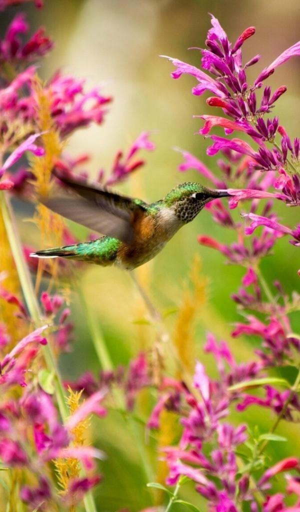 Обои Колибри среди розовых цветов
