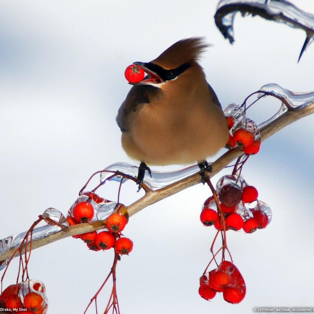 Обои Птица ест рябину