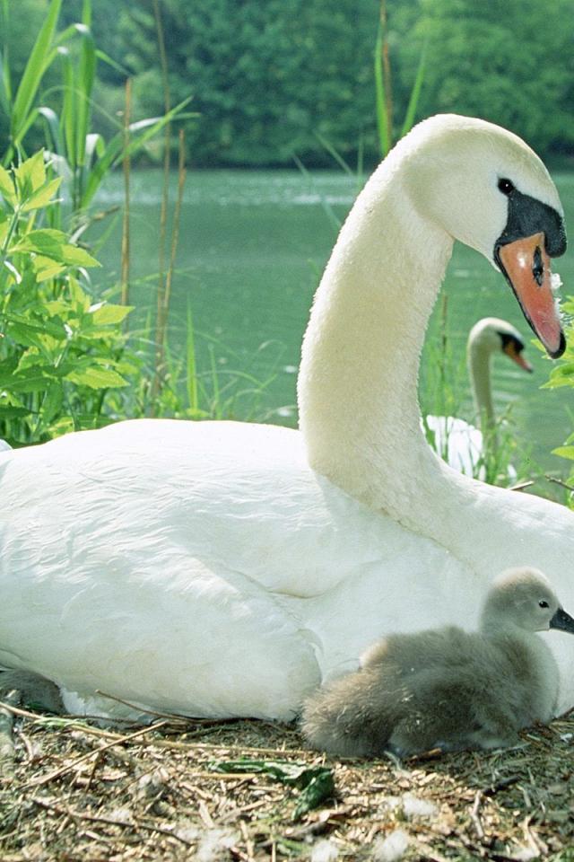 Обои Лебедь с птенцом