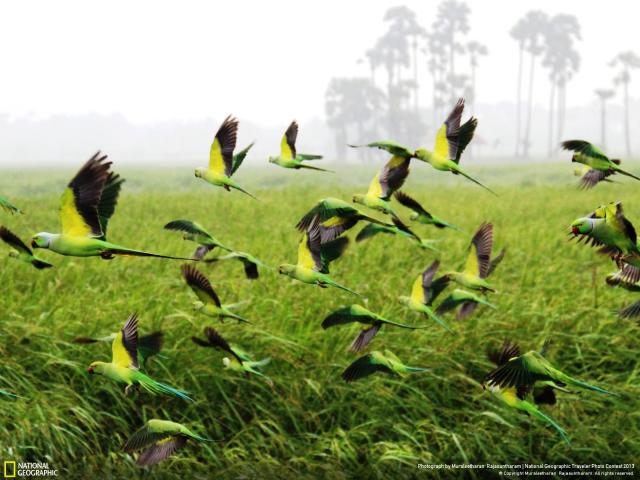 » Обои Взлетает стая попугаев