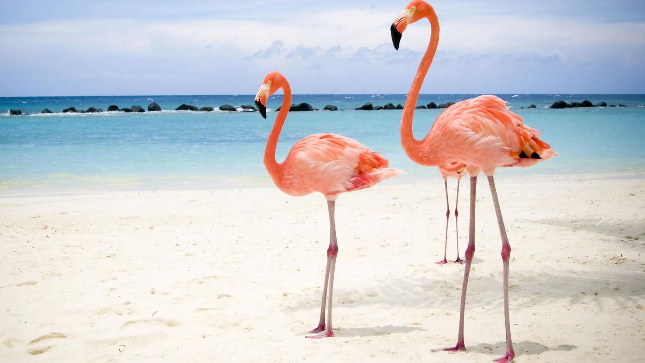 Обои Розовый фламинго на берегу