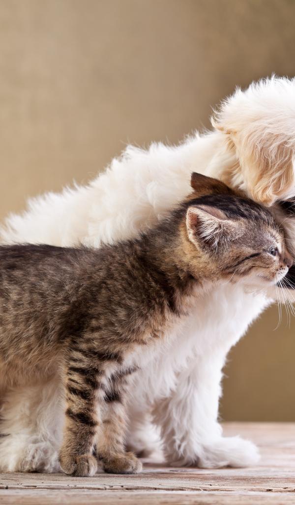 Обои Котенок и белый мальтийский щенок