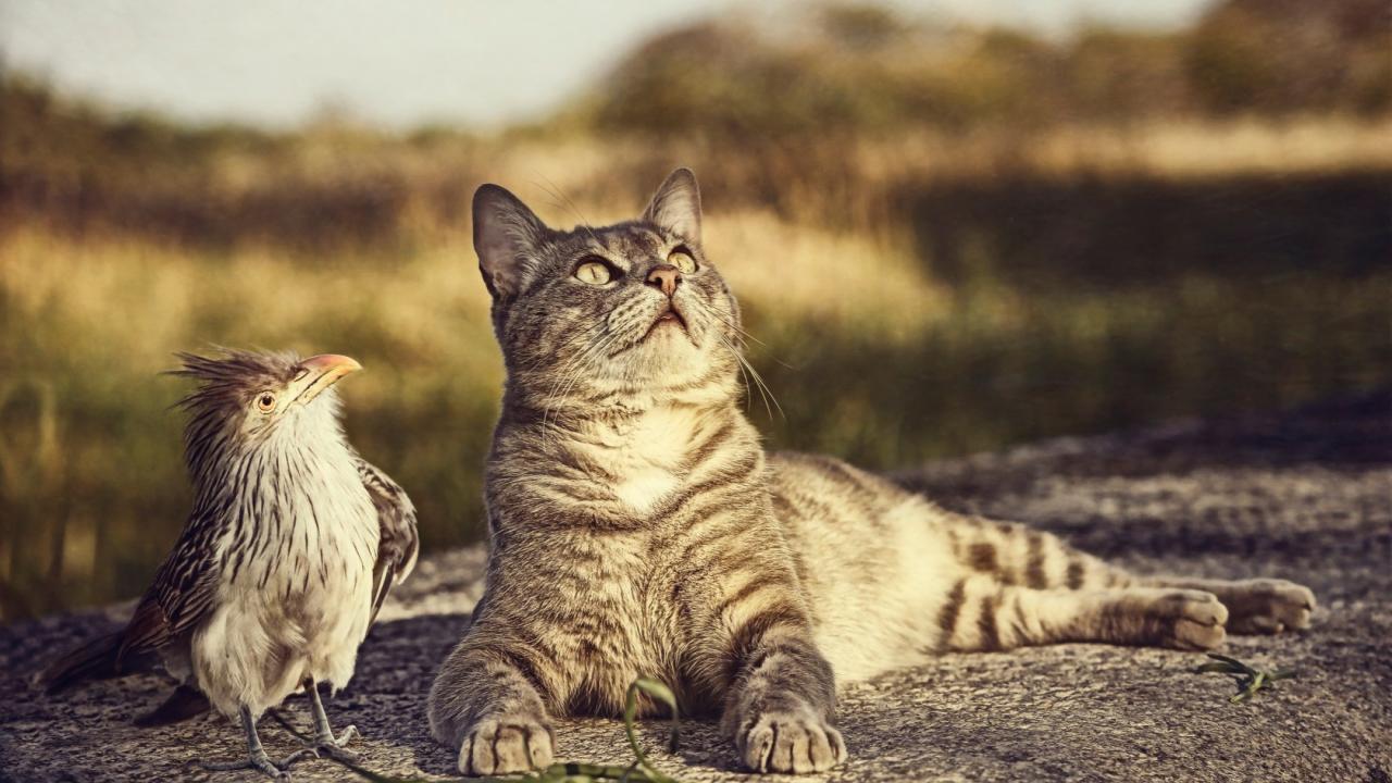 Обои Птица и кот смотрят вверх